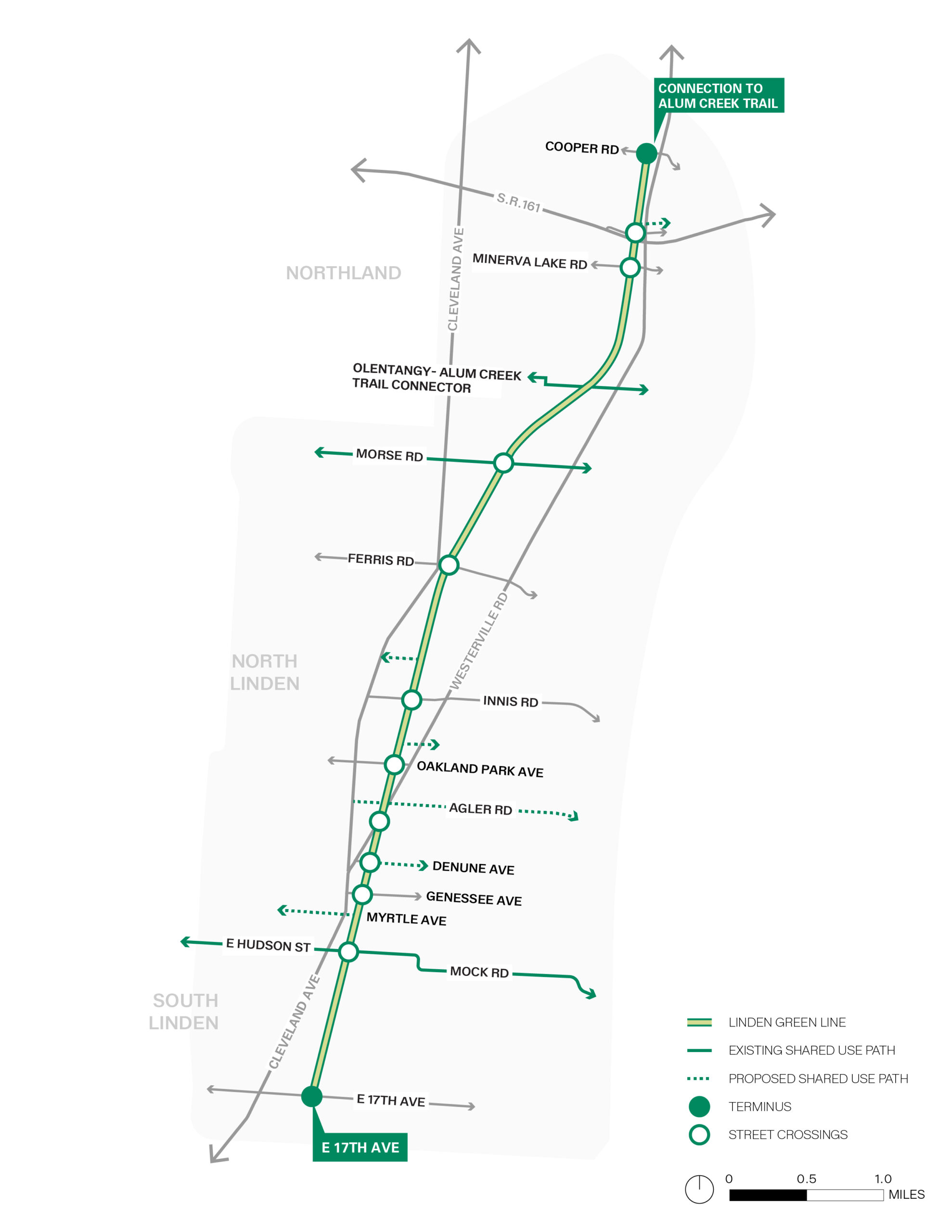 The Linden Green Line project area encompasses the former rail corridor that runs somewhat parallel to Cleveland Avenue and Westerville Road, along with key intersections, community assets and institutions that are adjacent or nearby. As part of the overall design effort, the team will look at how the Linden Green Line can support community growth, support broader conservation and connectivity goals, and anticipate future needs.