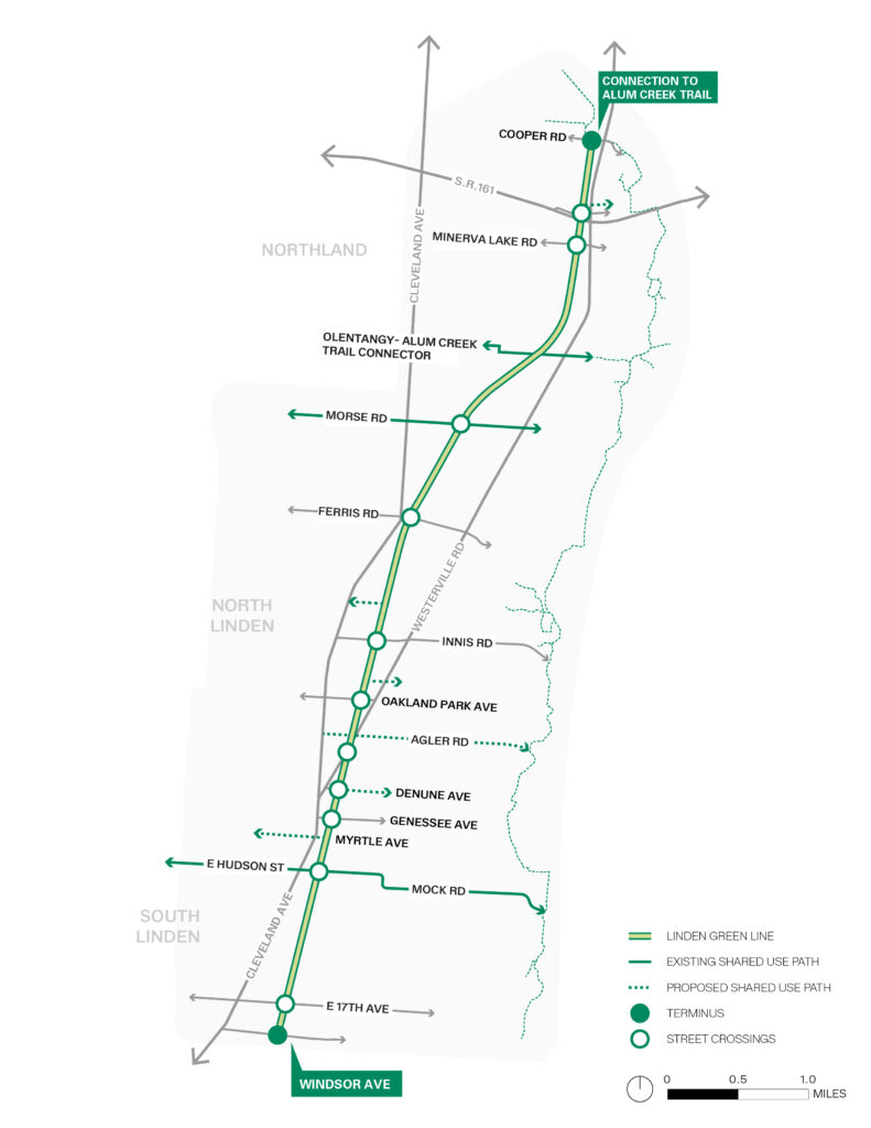 The Linden Green Line project area encompasses the former rail corridor that runs somewhat parallel to Cleveland Avenue and Westerville Road, along with key intersections, community assets and institutions that are adjacent or nearby. As part of the overall design effort, the team will look at how the Linden Green Line can support community growth, support broader conservation and connectivity goals, and anticipate future needs.