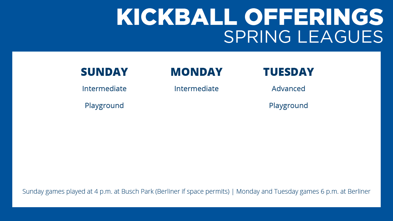 Columbus Recreation and Parks offers adult kickball leagues in the spring, summer and fall seasons.
