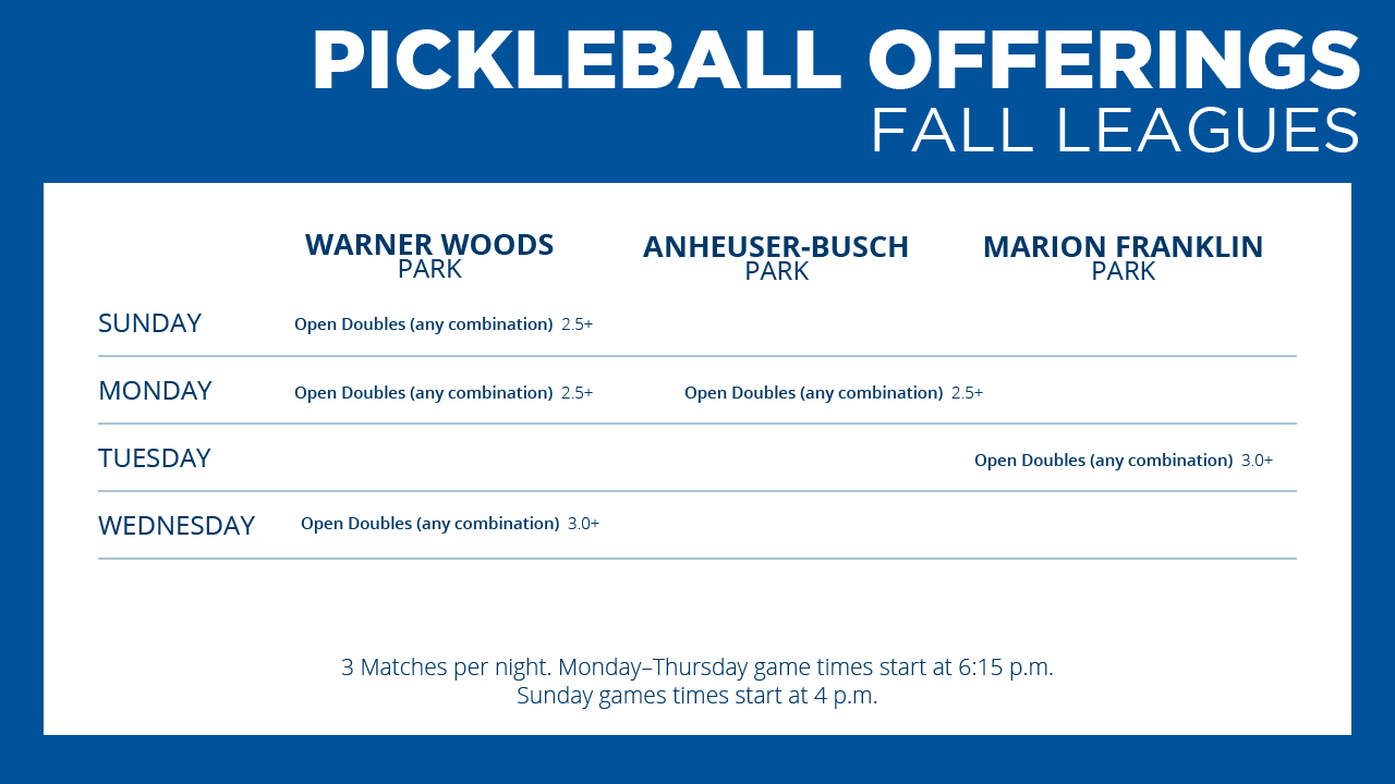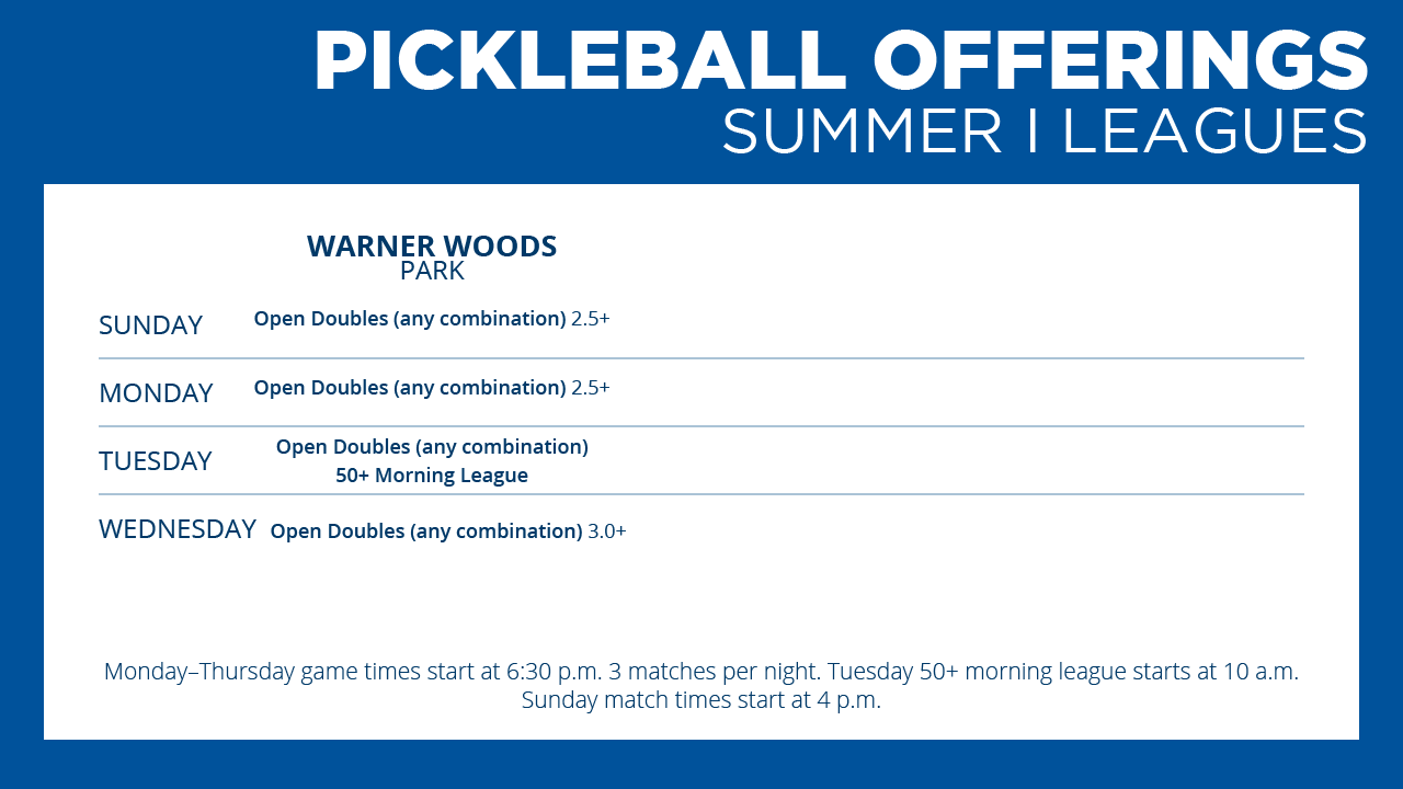 Columbus Recreation and Parks offers adult pickleball leagues in the spring, summer, and fall.
